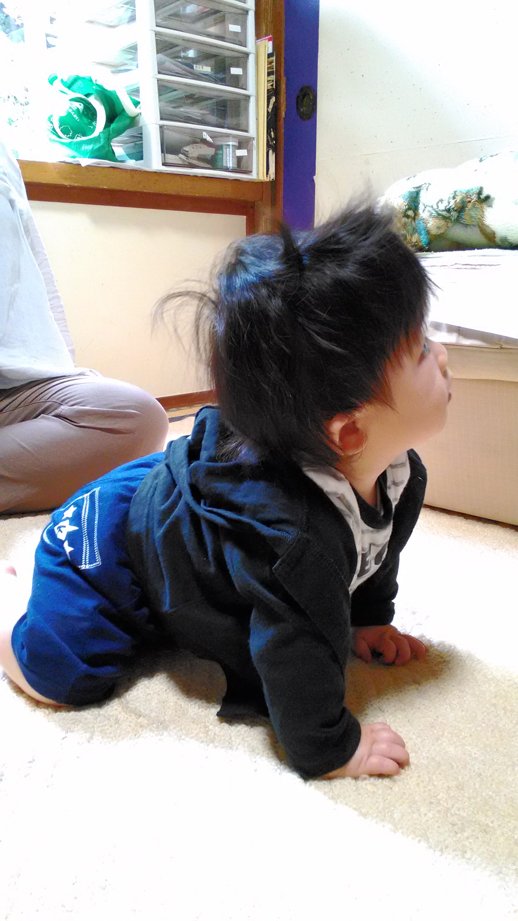 昴さん。寝返りからの成長が早く、ハイハイで台所まで来てしまうー。何度もリビングに戻される。
