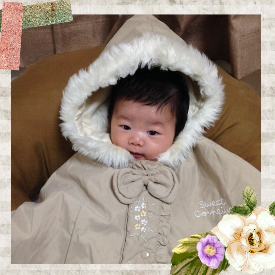 ・首を自力で支えられるようになりつつあります。(首が座るっていうのは、自分で向きたい方向に動かせるくらいのを言うらしいので、それはもっと後。今は首はそこまで気にして抱かないといけない程ではないけど、縦抱っこでぐらぐらしたのち、ごっちんと頭突きになっちゃうかんじ。)