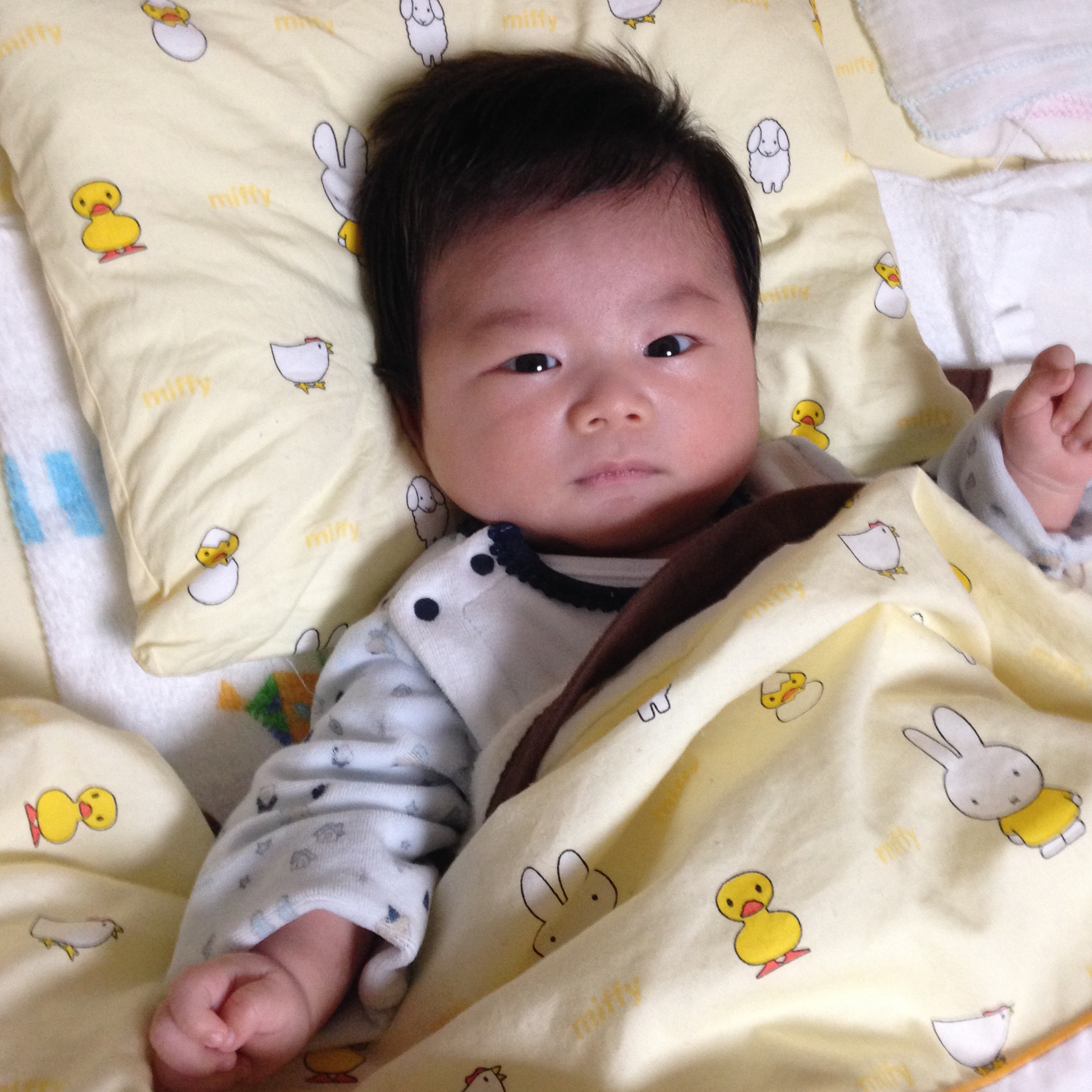 お腹もおむつもバッチリのはずなのにぐずぐず言ってたから、お母さんのベッドに一緒に入ってたけど、寝ない昴。