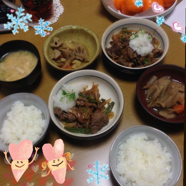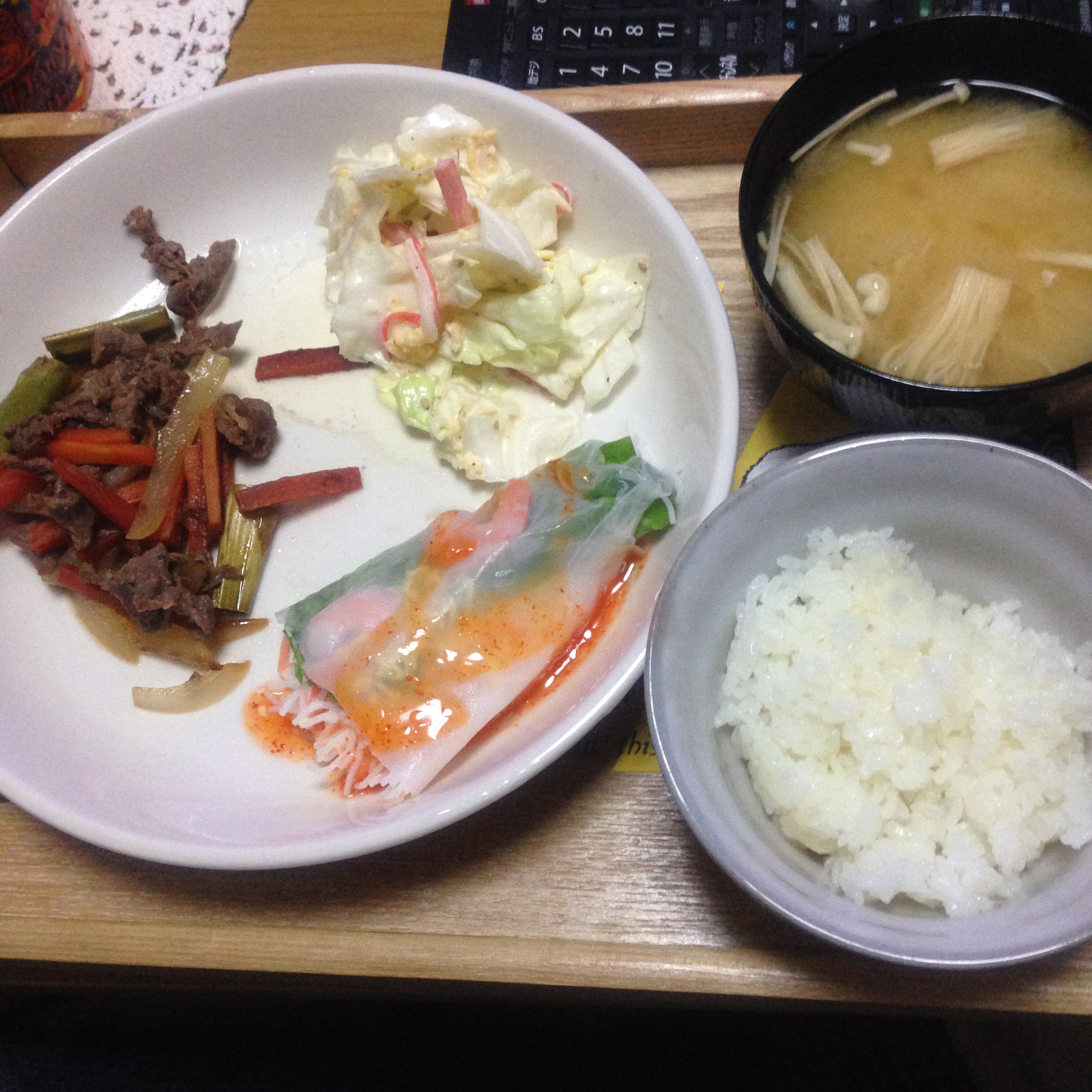 昨日の残りの筑前煮的なものと、牛肉のピリ辛炒め大根おろし乗せ(ク.ッ.ク.パ.ッ.ド.先.生参照。材料一部端折った)、味噌汁はエノキと油揚げに万能ネギちらしただけ。