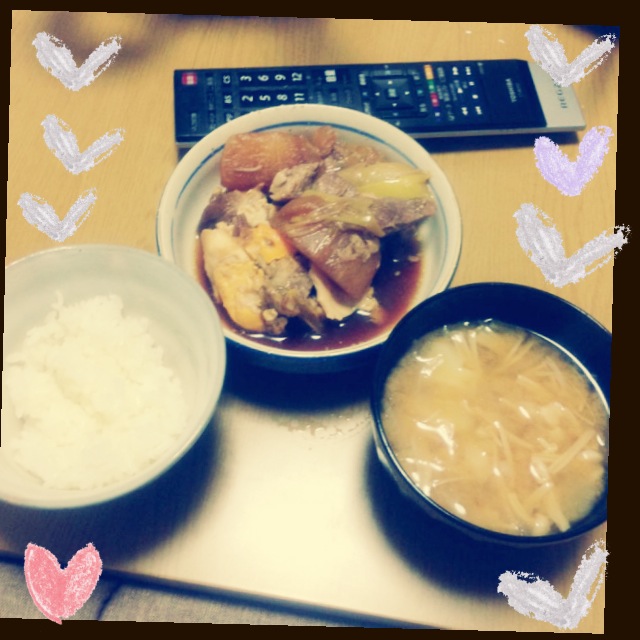 今日の夕飯は大根とねぎと玉子の入った角煮と、じゃが芋とえのきと玉ねぎの味噌汁と、柿。