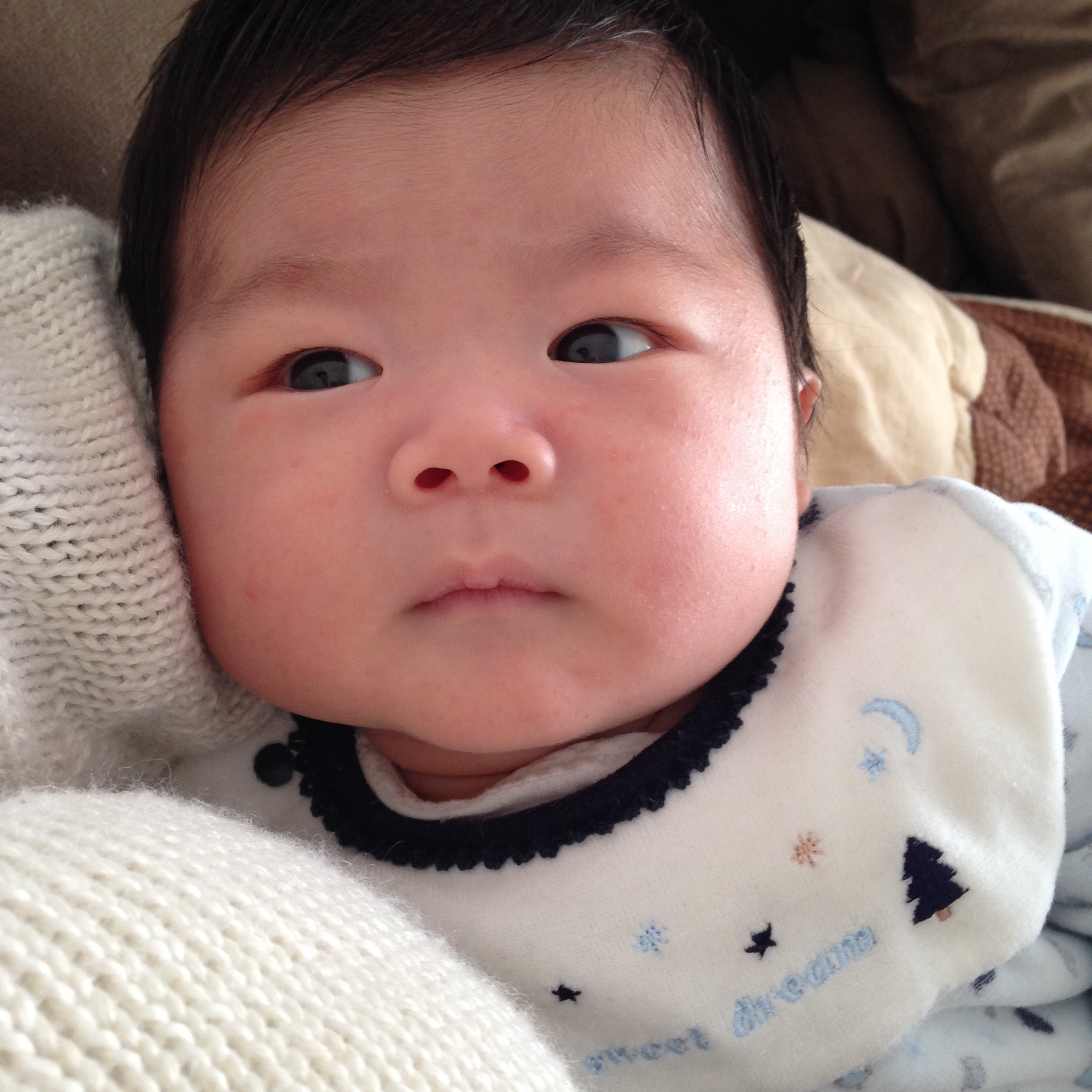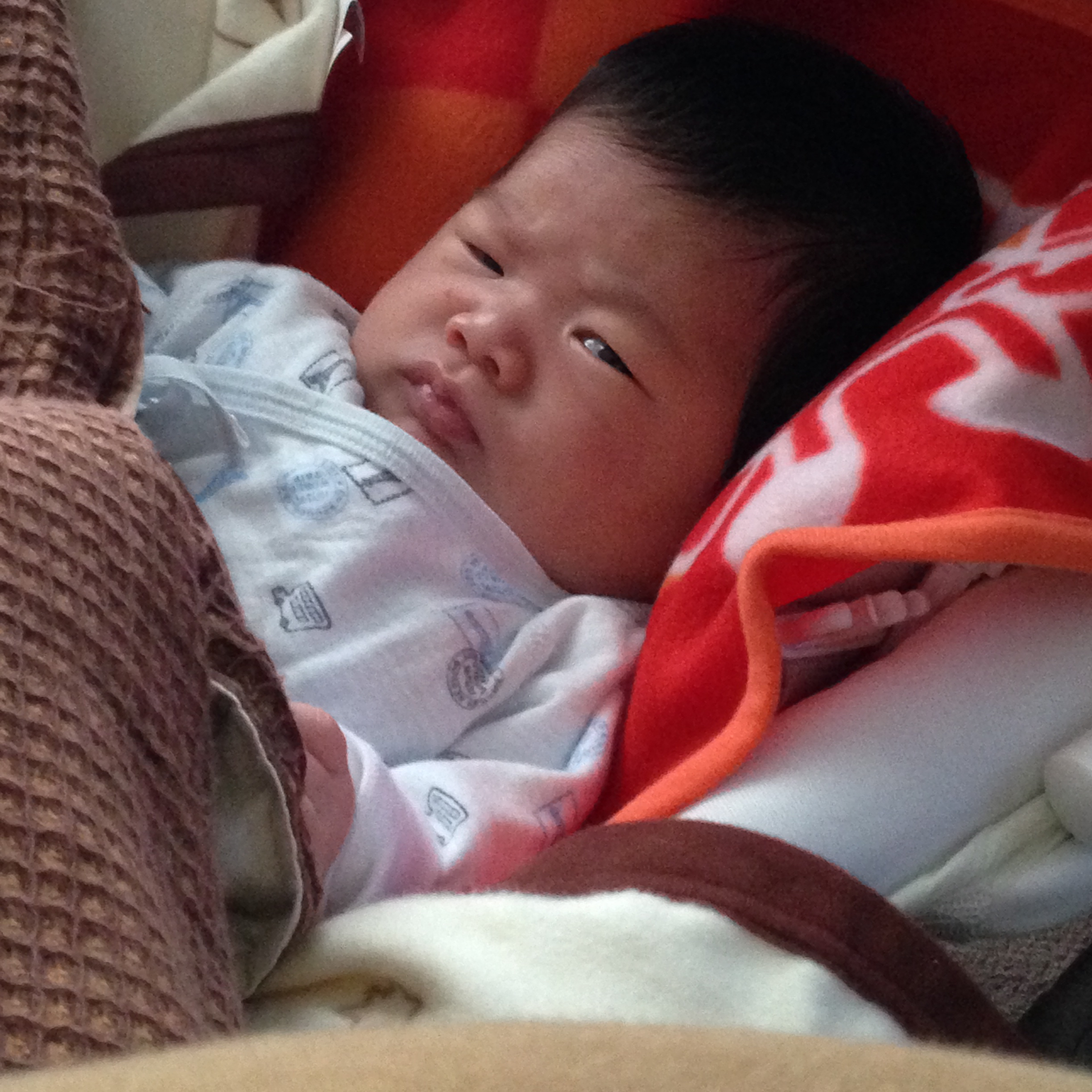 生後40日目の昴さんは、いつもの「泣くぞ泣くぞ」のぐずりだした時に、声をかけると相手してもらえる(乳貰える)のを理解してるのか、黙ってこっちを見るようになりました。