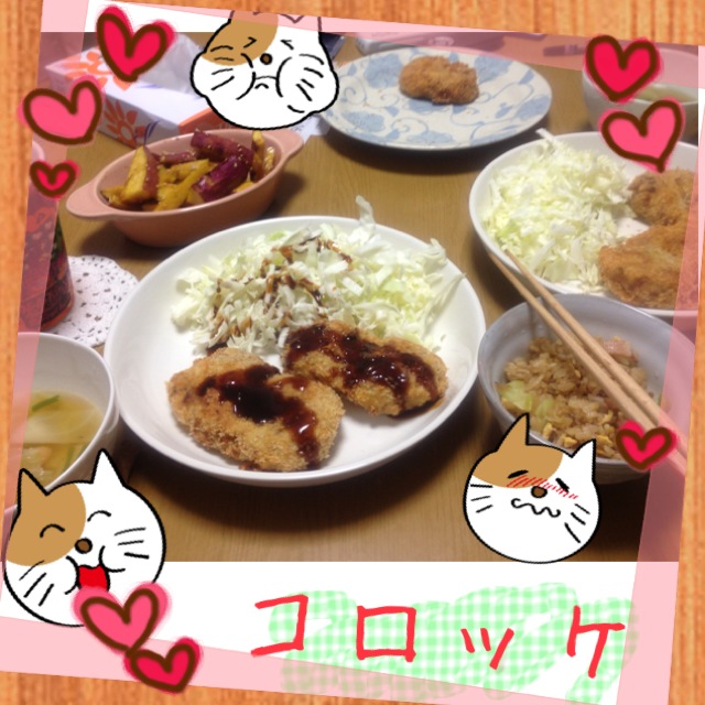 コロッケと、大学芋とコンソメスープ。あと昨日の残りのチャーハン。