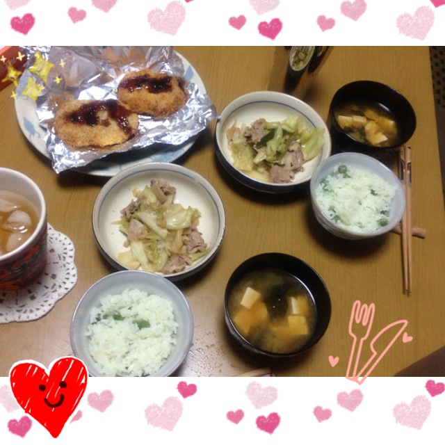 昨日の残りのコロッケ、野菜炒め、みそ汁、グリンピースの豆ご飯。