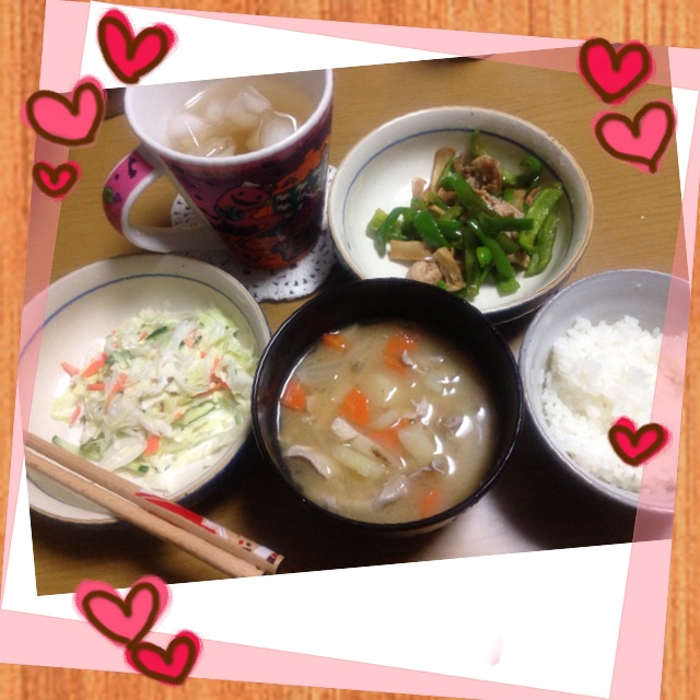 コールスローサラダと豚汁とエリンギとピーマンと肉の炒め物。豚汁は、適応に具沢山が好きで、今日はジャガイモ、タマネギ、エリンギ、肉、ニンジン、ゴボウが入ってる。うまー!全部美味しかった。