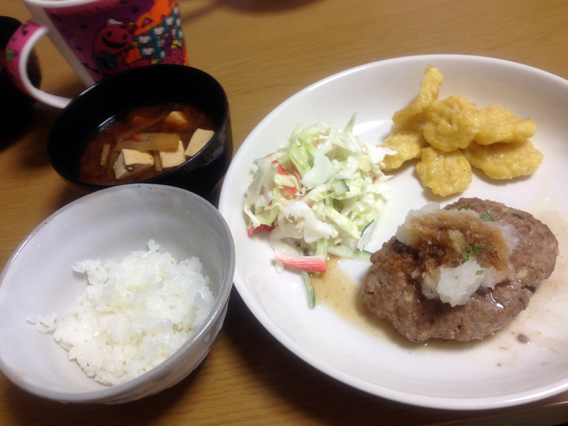 豆腐ハンバーグは、「元ハンバーグ屋さんがつくる」とか書いてあったやつです。タマネギも入れないしパン粉も卵も入れないの。豆腐と肉とシソだけ。シソはうちで育ててるやつです。10枚くらい入れろとか書いてあるから、うちのシソ鉢は丸ハゲになりましたけどねッ!( ´;∀;`)ブワッ