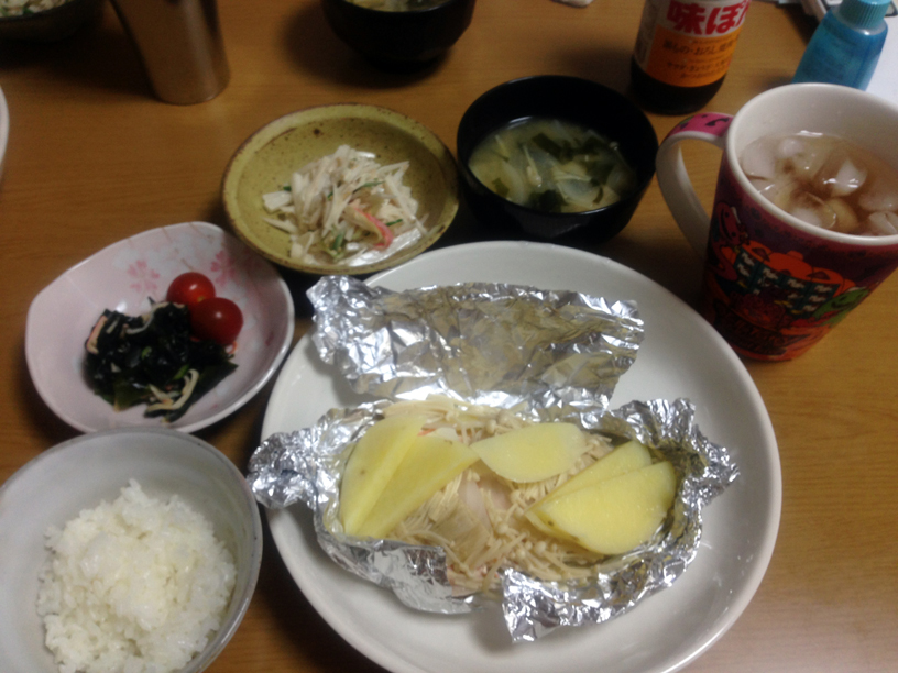 鮭のホイル焼き(タマネギ、えのき、じゃがいも)