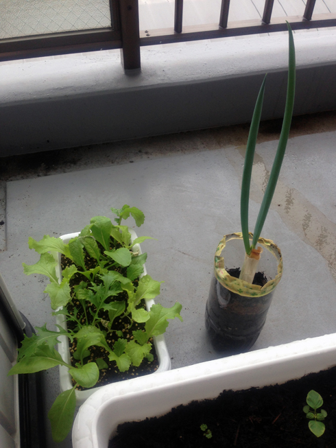 ネギは、1本長く長く成長してたんですが、雨が降った次の日には2本目が追いついてました。そして今はその間から3本目が成長しています。(ということは、もう食べていいよね)